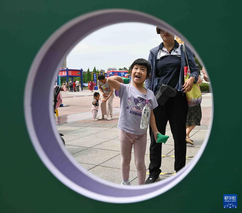 5月30日,小朋友在重庆市永川区兴龙湖广场体验扔“粽子”游戏。新华社记者 陈诚 摄