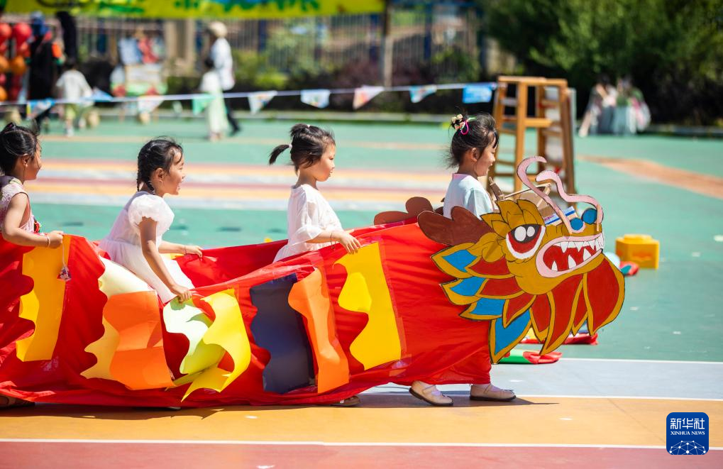5月30日,在江西省九江市都昌县中心幼儿园,孩子们参加“旱龙舟”比赛活动。新华社发(傅建斌 摄)