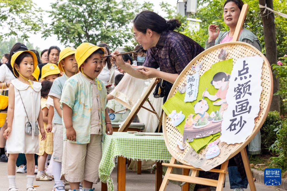5月30日,老师在江苏省泰州市海陵区秋雪湖幼儿园给小朋友额头上点朱砂。新华社发(汤德宏 摄)
