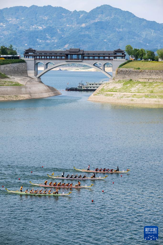 5月30日,参赛队伍在湖北省宜昌市秭归县徐家冲港湾水域举行的2025屈原故里传统龙舟大赛中赛龙舟。新华社发(郑家裕 摄)