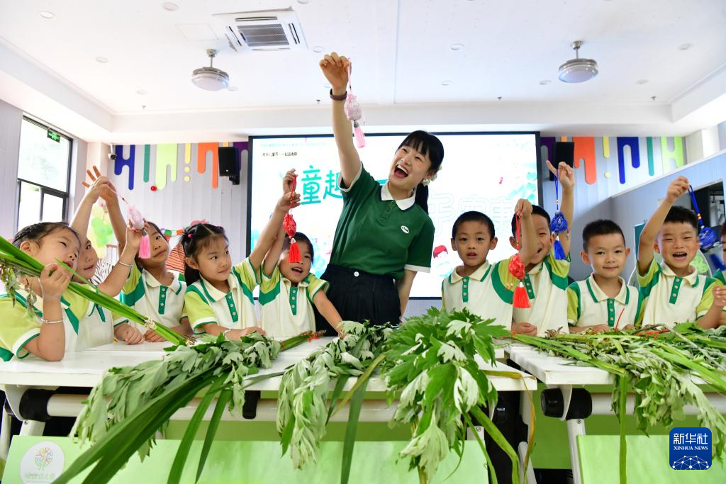5月30日,在浙江省建德市明珠幼儿园,老师在向孩子们讲解挂艾草、制作香囊等传统文化习俗知识。新华社发(宁文武 摄)