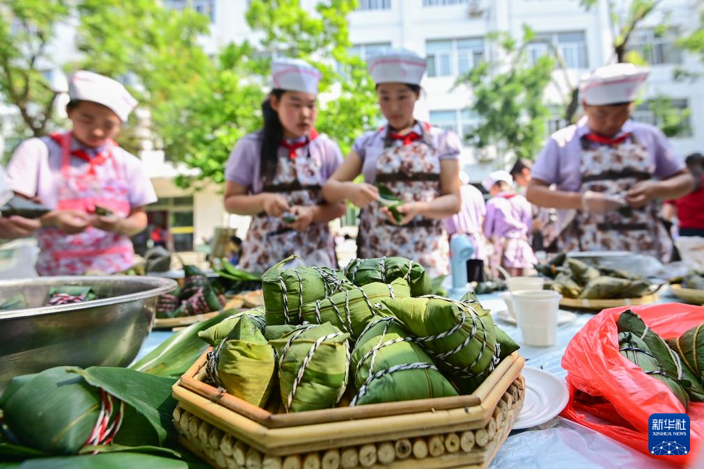 5月30日,在山东省青州市西苑小学,学生们在比赛包粽子。新华社发(王继林 摄)