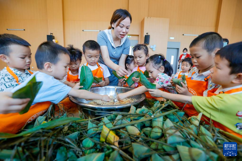 5月30日,在江西省吉安市峡江县城西幼儿园,小朋友们在体验包粽子。新华社发(陈福平 摄)