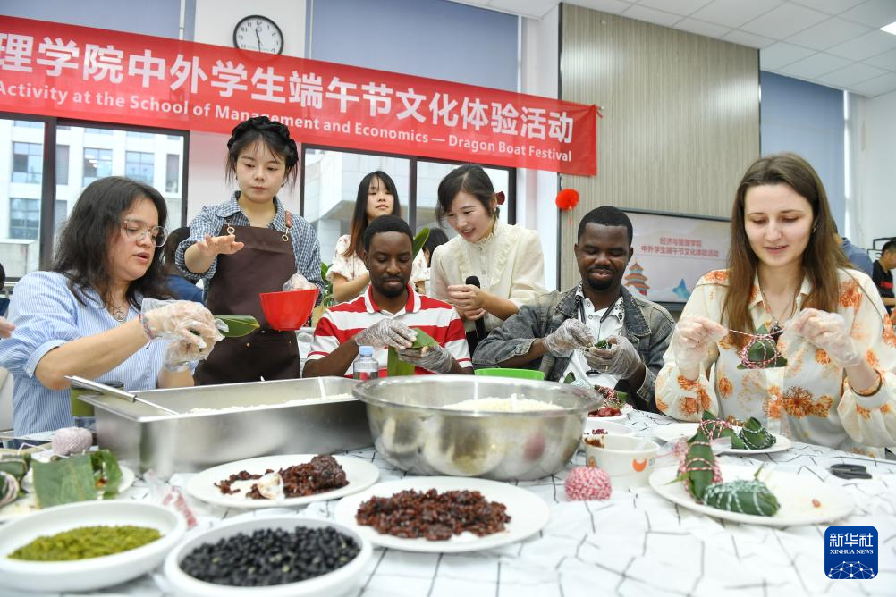 5月30日,在四川省成都市高新西区的电子科技大学经济与管理学院,留学生在学习包粽子,体验中国传统文化的魅力。新华社发(李向雨 摄)