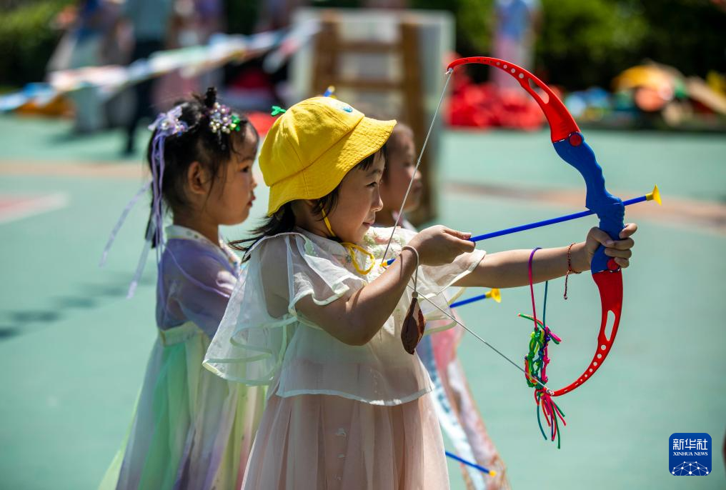 5月30日,在江西省九江市都昌县中心幼儿园,小朋友在体验“射五毒”活动。新华社发(傅建斌 摄)