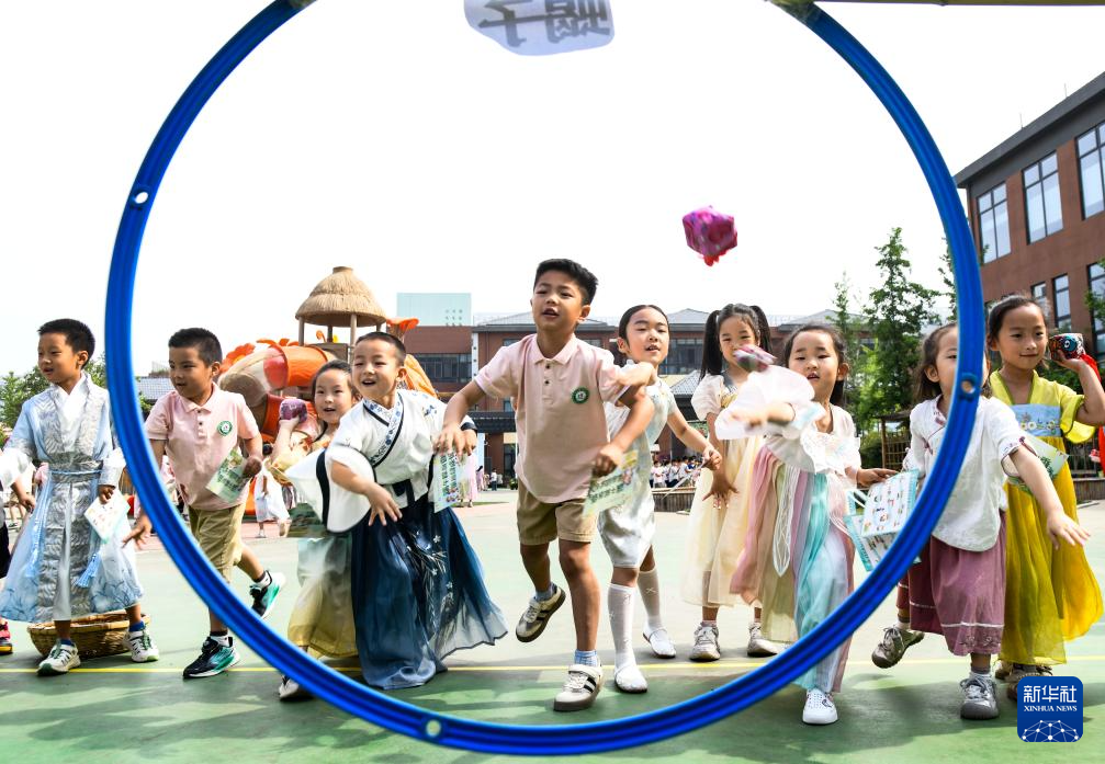 5月30日,在河南省济源市愚公路幼儿园,小朋友玩“投五毒”游戏。新华社发(苗秋闹 摄)