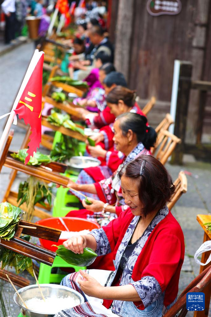 5月30日,在重庆市黔江区濯水古镇老街,穿着民族服装的选手在参加包粽子比赛。新华社发(杨敏 摄)
