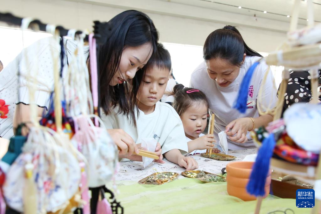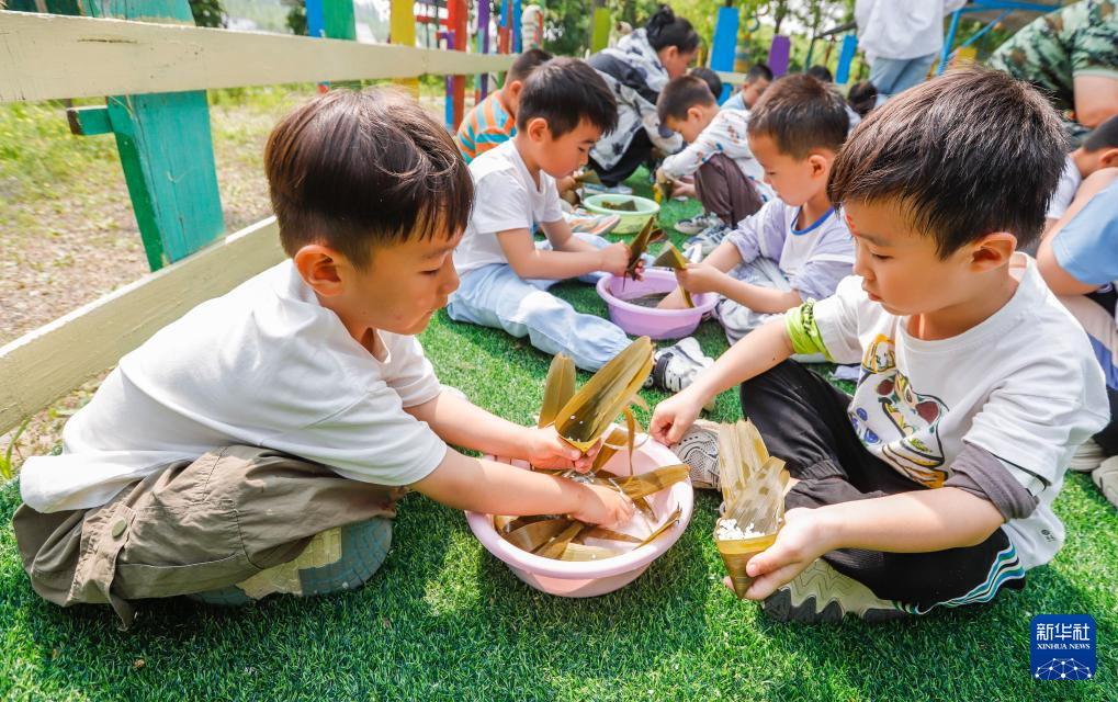5月30日,在河北省遵化市小厂乡一自然教育基地,小朋友在体验包粽子。新华社发(刘满仓 摄)