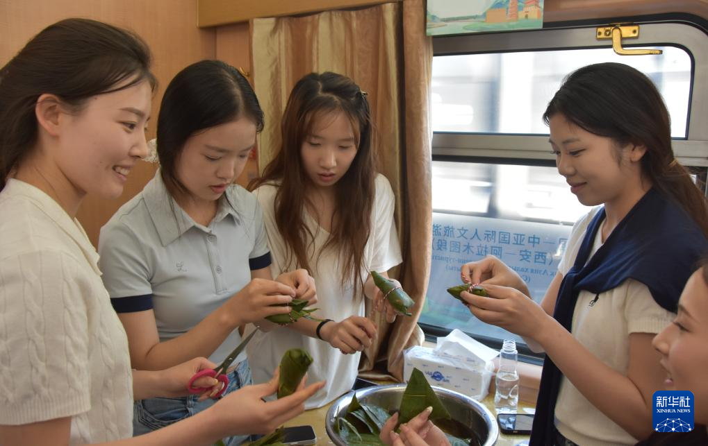 5月30日,在中国—中亚国际人文旅游专列(西安—阿拉木图段)上,乘客在包粽子。新华社记者 杨一苗 摄