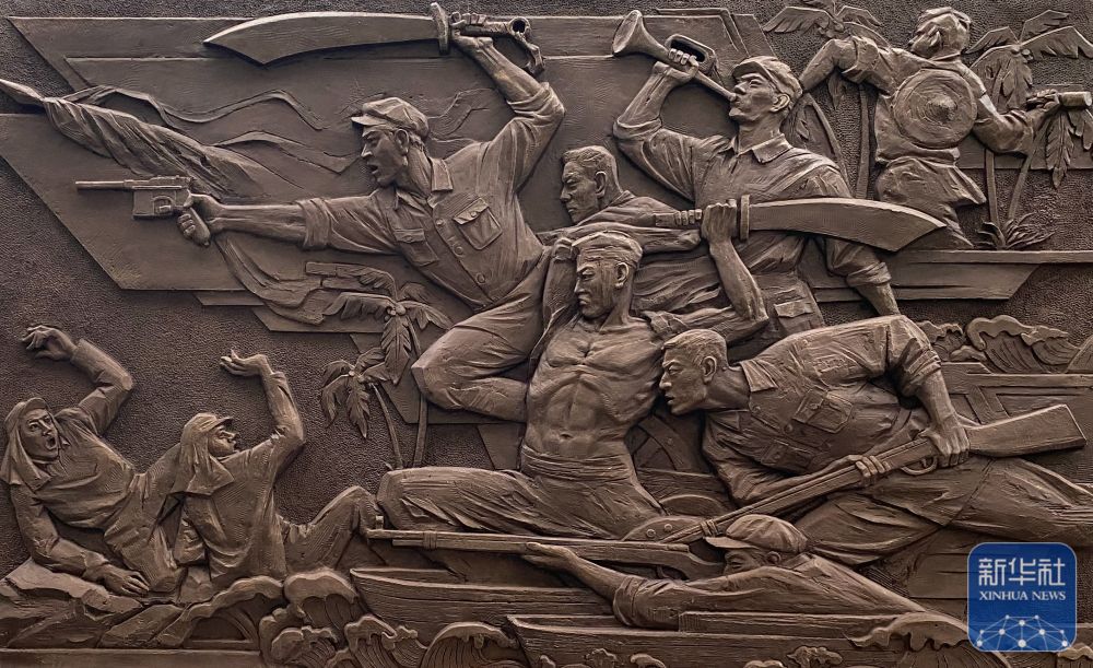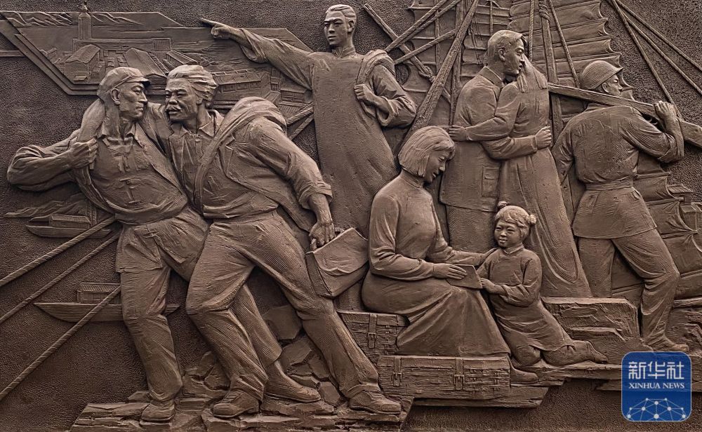 ↑ 这是解放军文工团雕塑创作员郎钺创作的,以东江纵队抗战为背景的浮雕《南粤烽火 卫士先驱》。新华社发