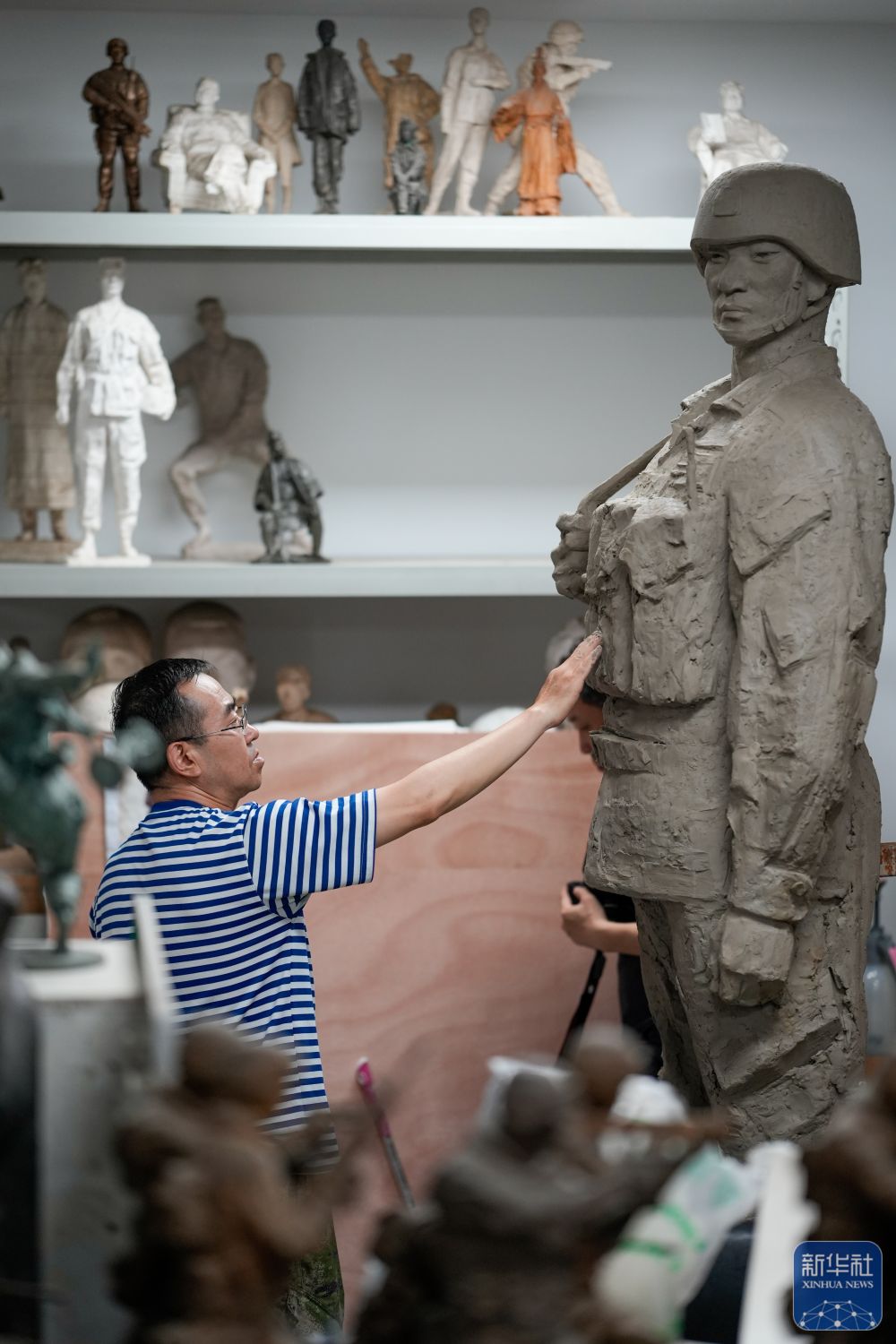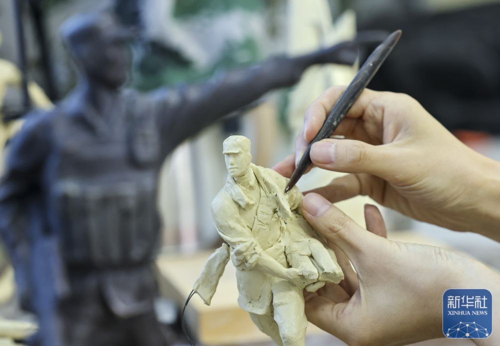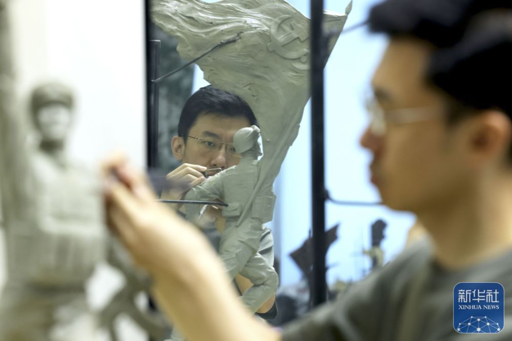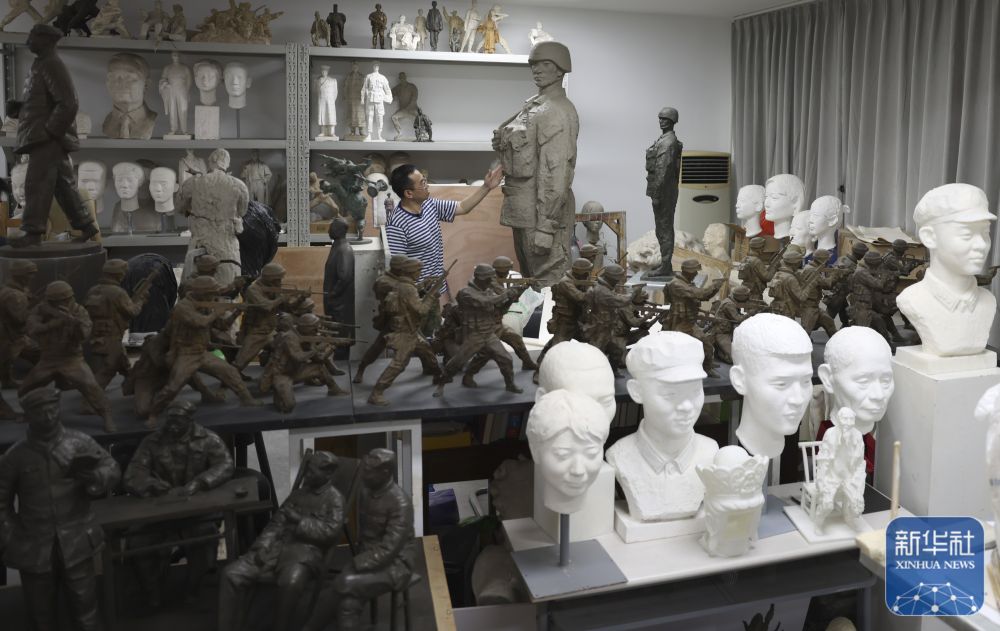 ↑ 7月17日,解放军文工团雕塑创作员郎钺在进行雕塑创作。新华社记者 殷刚 摄