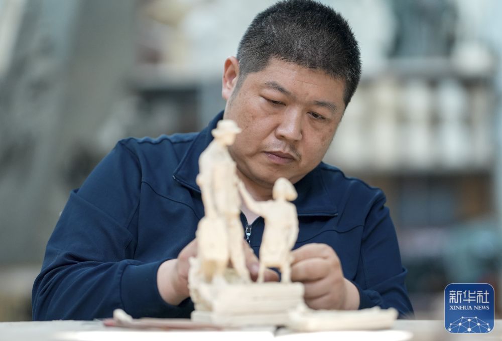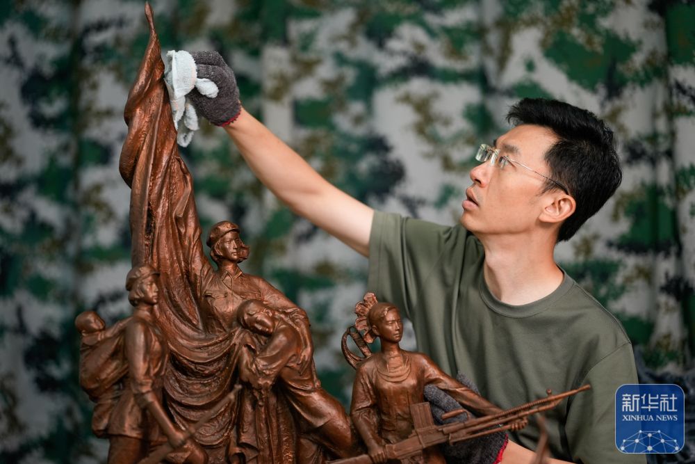 ↑ 7月17日,解放军文工团雕塑创作员郎钺在擦拭雕塑。新华社记者 周荻潇 摄
