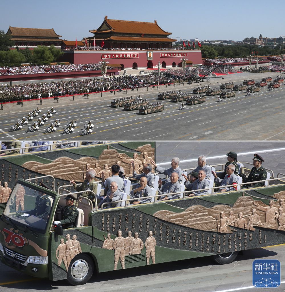 ↑ 这是在中国人民抗日战争暨世界反法西斯战争胜利70周年纪念大会上拍摄的、由谈强带领中国人民革命军事博物馆团队设计制作的抗战老兵和抗战支前模范乘车方队车辆两侧的浮雕(拼版照片,2015年9月3日摄)。浮雕再现了东北抗联艰苦斗争、卢沟桥激战、百团大战、淞沪会战和中国远征军作战等中国抗战历史瞬间。新华社记者 殷刚 摄