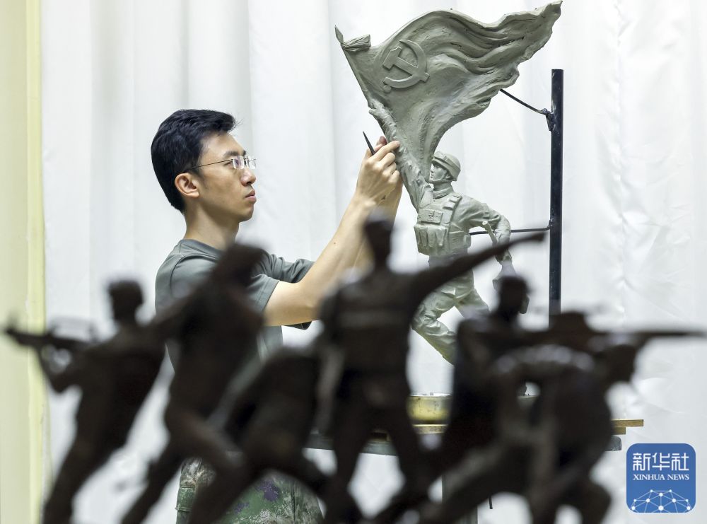 ↑ 7月24日,国防大学军事文化学院副教授王树山在进行雕塑创作。新华社记者 周荻潇 摄