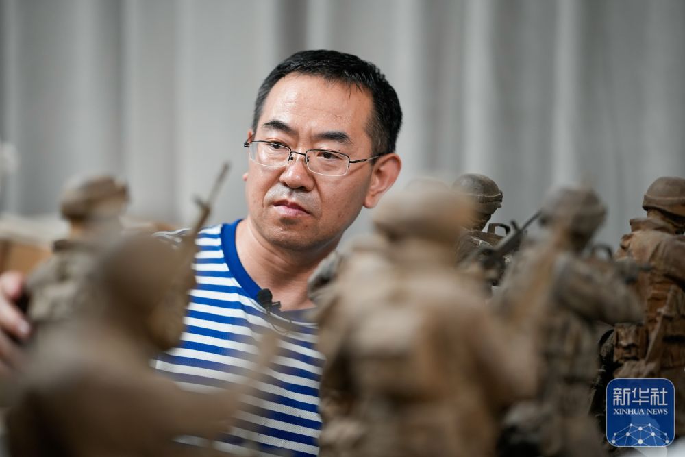 ↑ 7月24日,国防大学军事文化学院副教授王树山在查看自己的雕塑作品。新华社记者 周荻潇 摄
