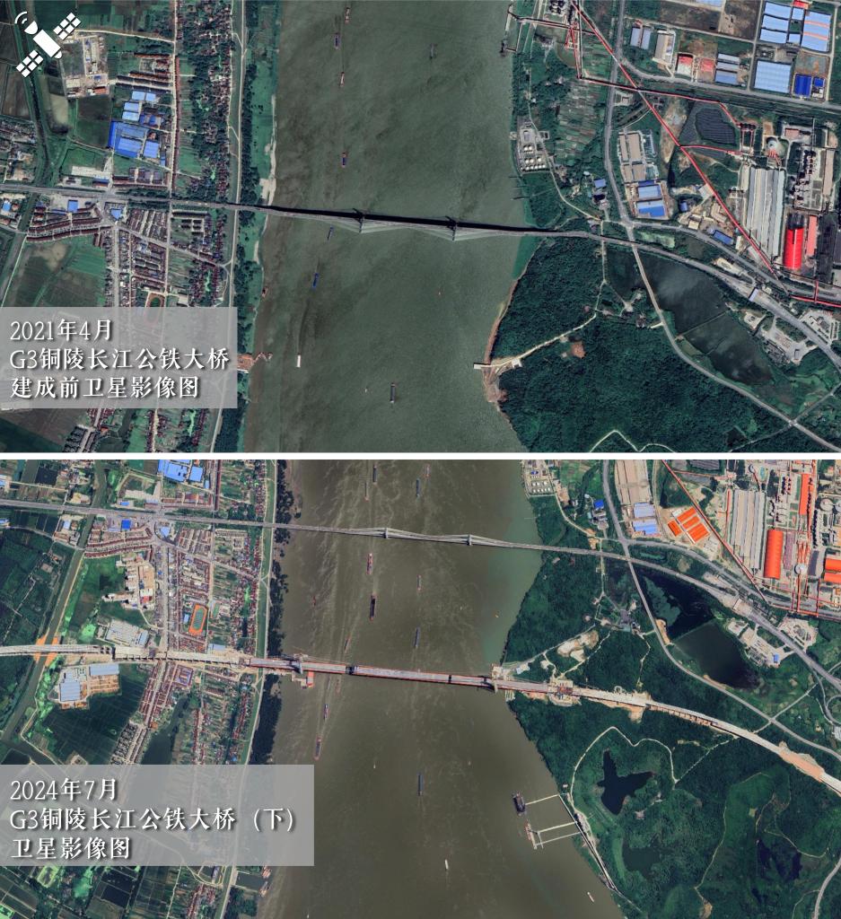 解读:2021年4月开工前(上图)对比合龙前的2024年7月(下图),铜陵长江公铁两用大桥横跨江面,与原有大桥相邻而建。