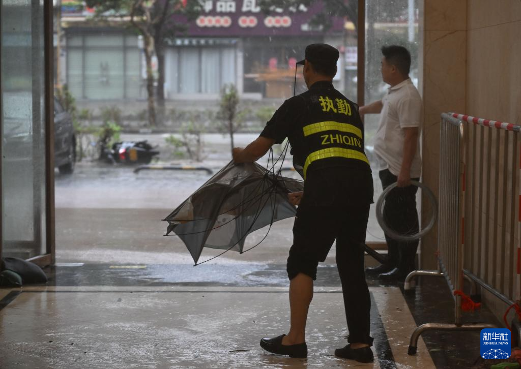 9月24日,在广东阳江市江城区横一路一家酒店外,保安查看设施损毁情况。新华社记者邓华摄