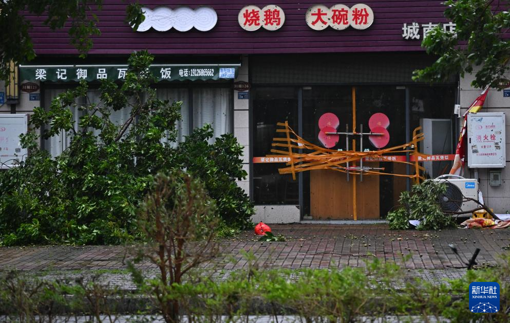 9月24日,在广东阳江市江城区横一路,被风吹断的树枝落在一家饭店门外。新华社记者邓华摄
