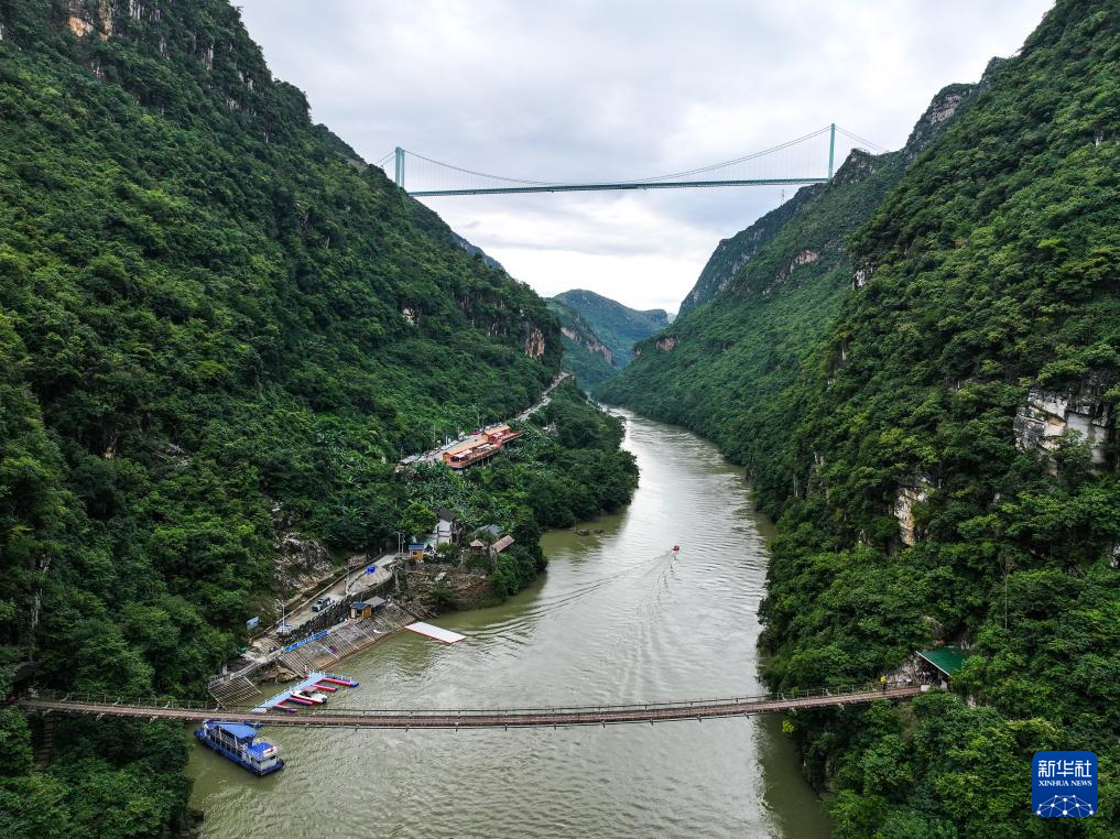 花江峡谷中的铁索桥与花江峡谷大桥遥相呼应(9月27日摄,无人机照片)。新华社记者 杨文斌 摄