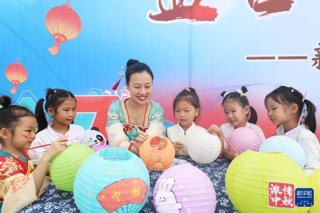 9月29日,河北省唐山市丰润区新城道幼儿园举行的“花好月圆 古韵迎中秋”主题活动中,小朋友在老师的指导下学习彩绘灯笼。新华社发(朱大勇摄)