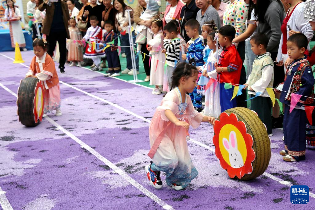 9月30日,湖北省十堰市郧阳区金色摇篮幼儿园孩子们参加“滚月饼”比赛。新华社发(曹忠宏摄)