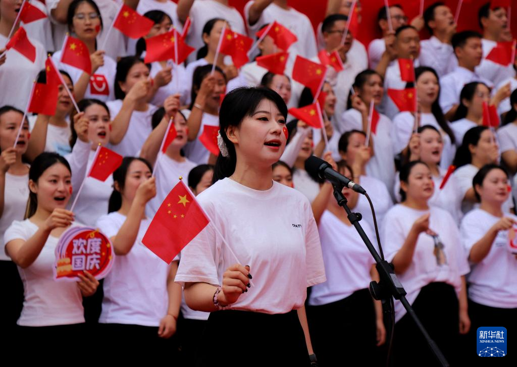 9月30日,在河南省南阳市区万悦城广场,当地群众齐唱歌曲《我和我的祖国》。新华社发(高嵩摄)