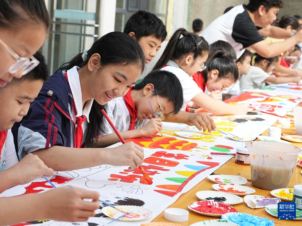 9月30日,河北省石家庄市宁安路小学师生在校园开展“童心彩绘迎国庆”活动。新华社发(闫志国摄)