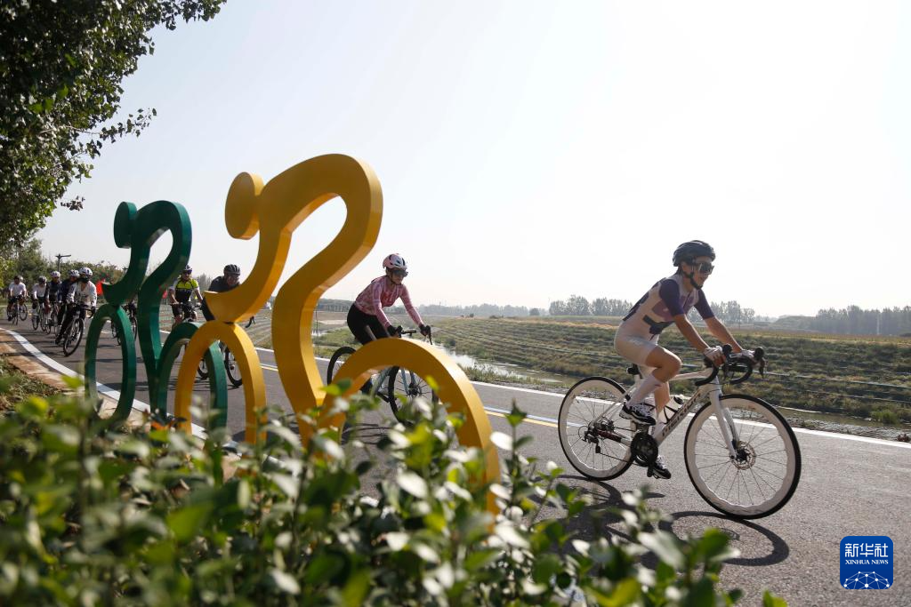 9月30日,在河北省邢台市高新区举行的骑行迎国庆活动中,骑行爱好者在祝村镇牛尾河畔骑行。新华社发(张驰摄)