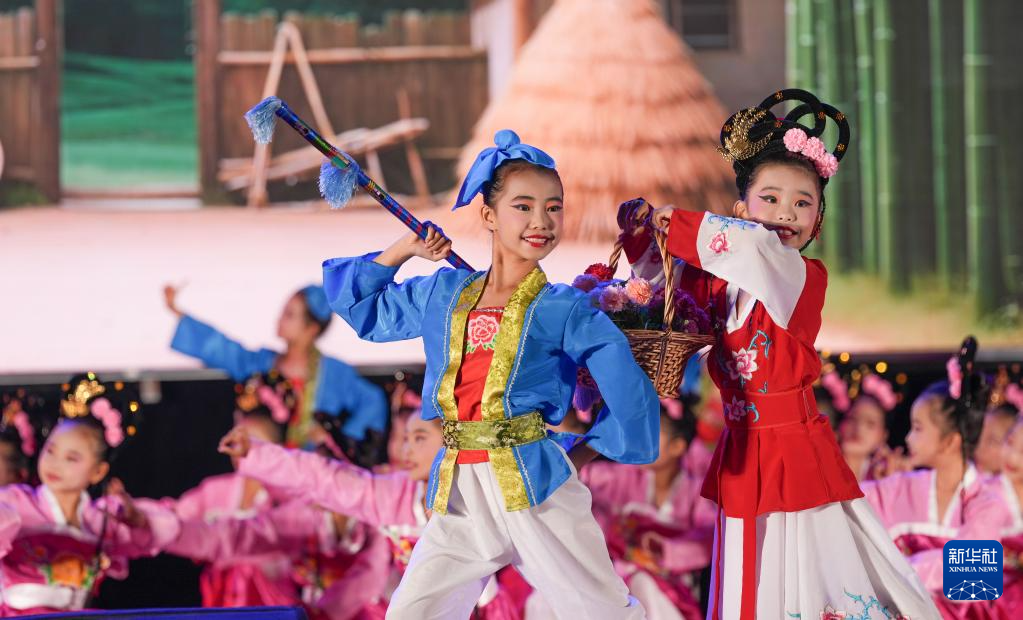 9月29日,山东省邹平市小学生在迎国庆活动中表演黄梅戏《打猪草》。新华社发(董乃德摄)