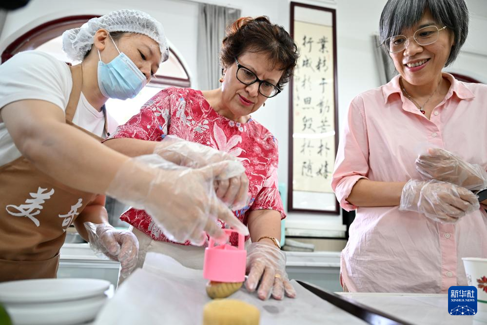 9月30日,在海口市外事办公室举办的中秋文化交流活动中,中外友人在体验月饼制作。新华社记者 郭程 摄