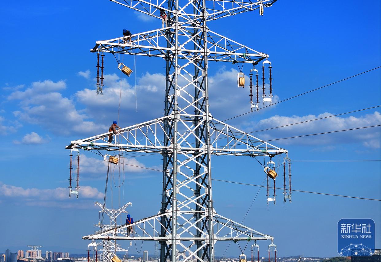 ↑ 10月3日,在湖南省衡阳市雁峰区岳屏镇,施工人员在真武-麻塘220千伏线路改造工程项目开展架线施工作业 (无人机照片)。新华社发(曹正平摄)