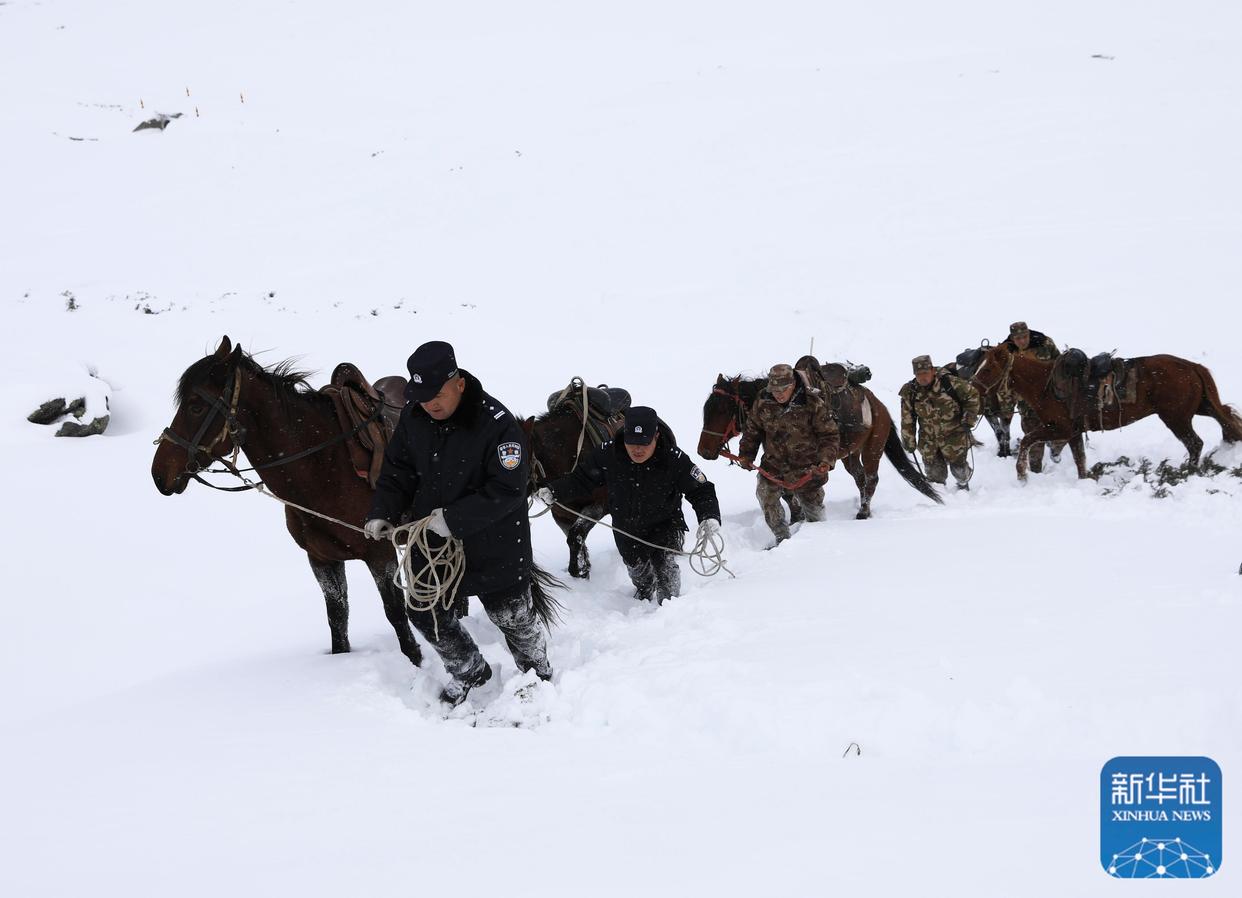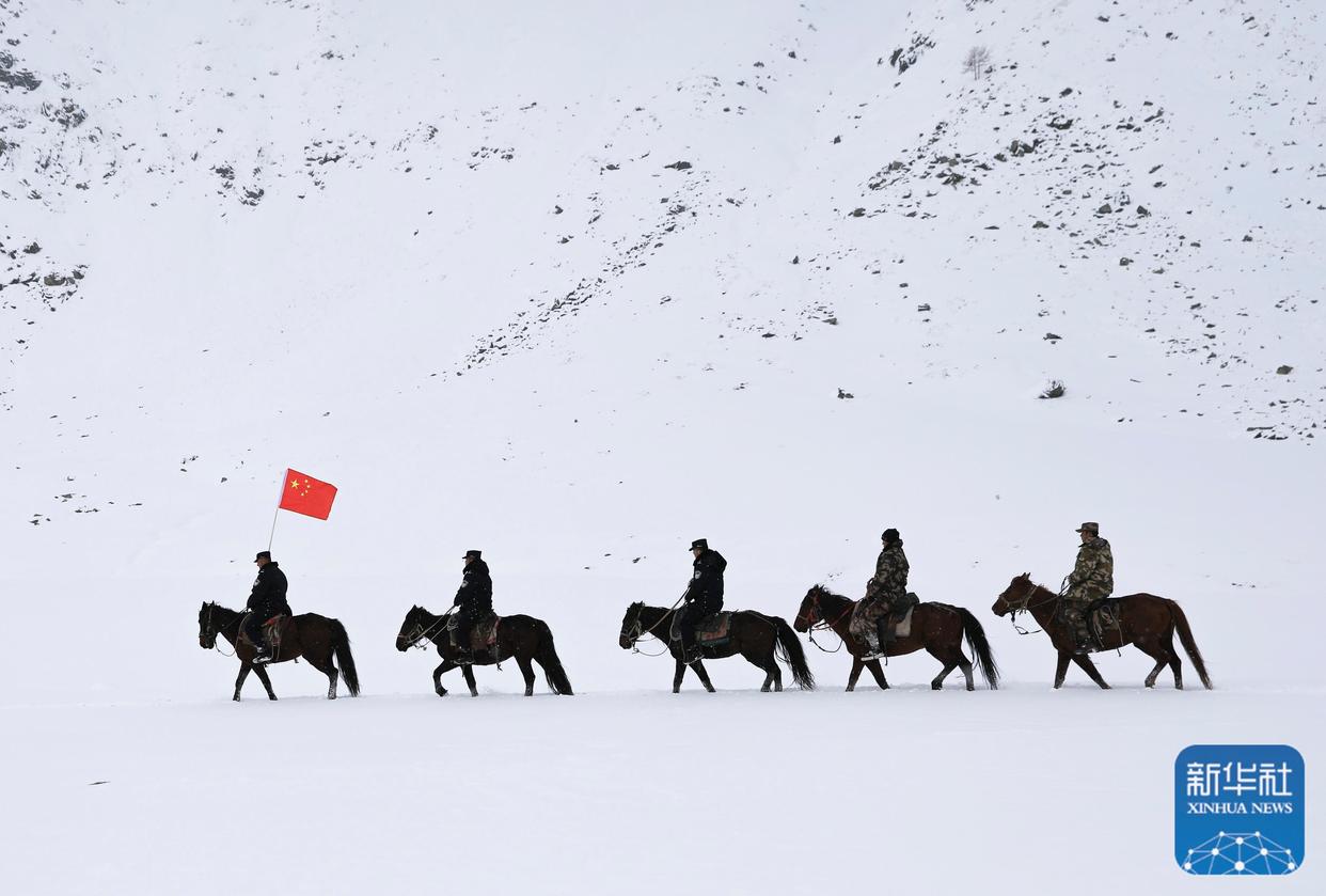 ↑ 10月2日,新疆阿勒泰边境管理支队库尔木图边境派出所民警与护边员组成的巡逻队在风雪中巡逻。新华社发(叶尔江·木哈买提摄)
