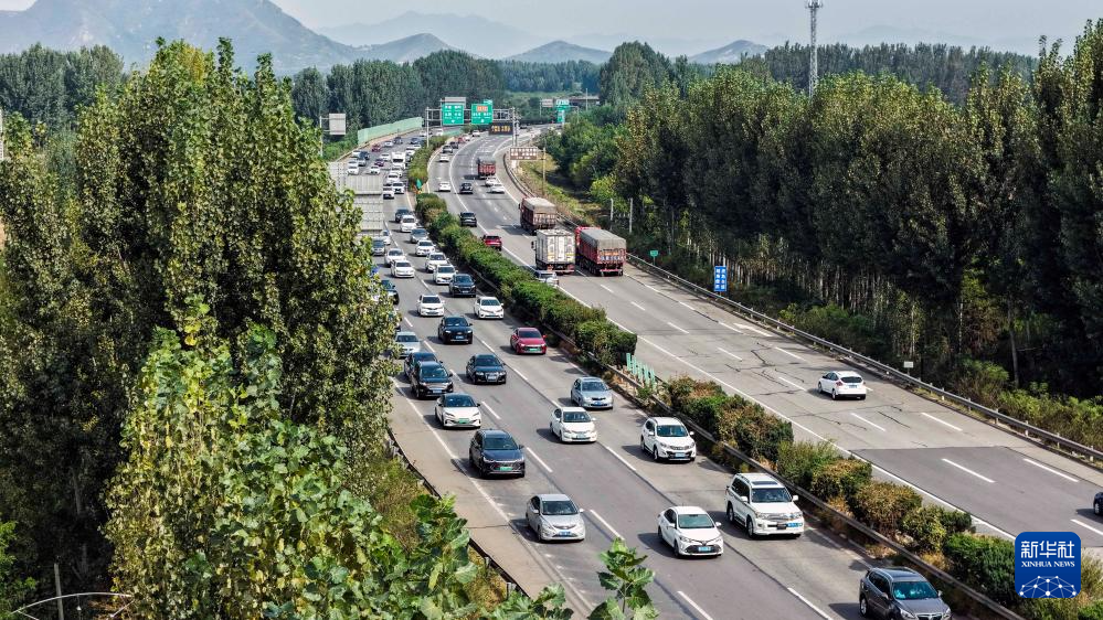 10月7日在河北省遵化市境内拍摄的承唐高速公路车流(无人机照片)。新华社发(刘满仓摄)