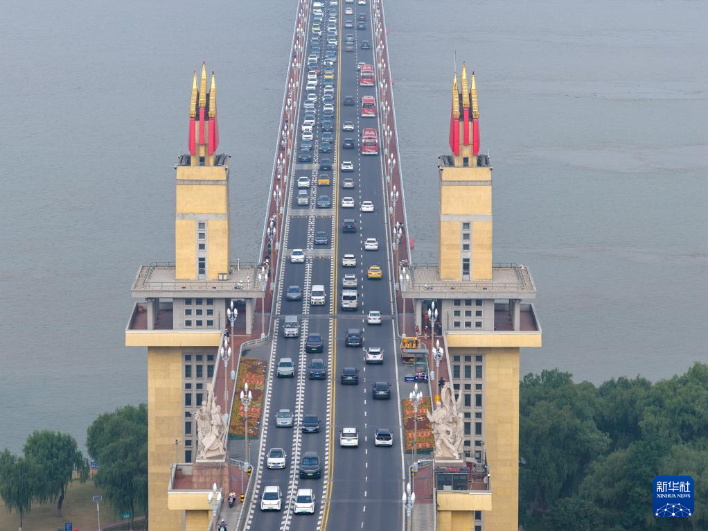 10月7日拍摄的南京长江大桥上的车流(无人机照片)。新华社发(杨素平 摄)