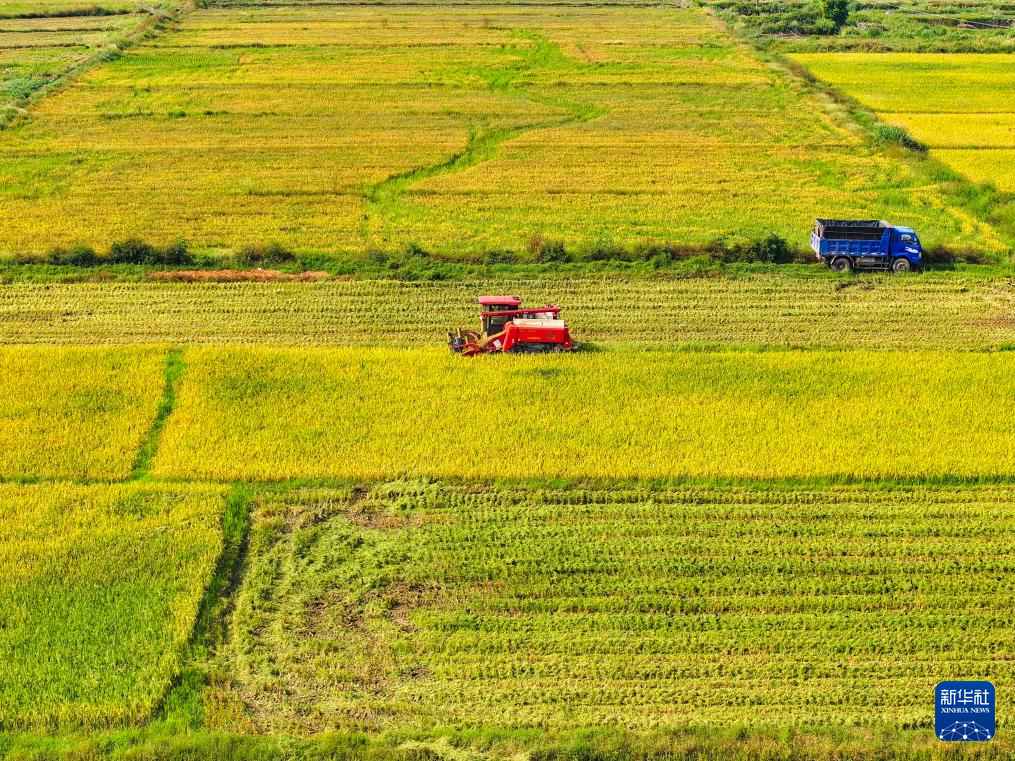 10月11日,湖南省常宁市洋泉镇农民驾驶收割机在收获水稻(无人机照片)。新华社发(周秀鱼春摄)