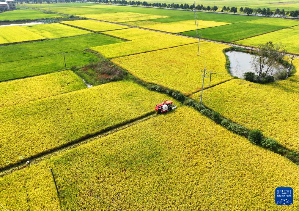 10月11日,在江苏省扬州市邗江区公道镇,农民驾驶农机收割水稻(无人机照片)。新华社发(孟德龙摄)