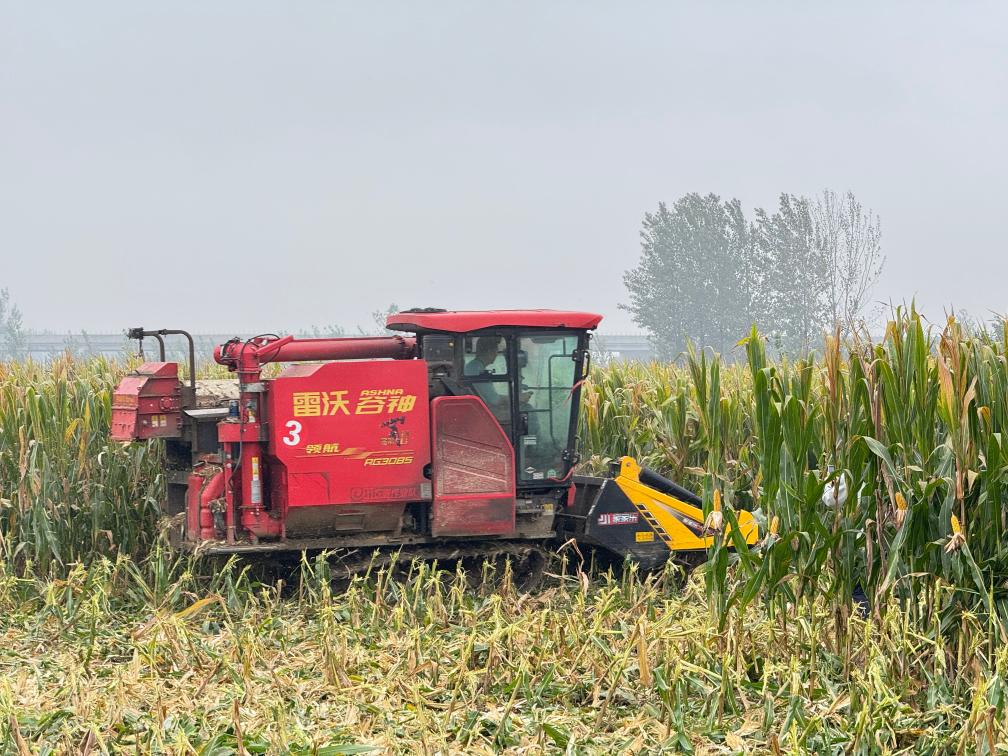 “轰隆隆……”在河北省邯郸市广平县平固店镇大庙村村民赵国英的玉米田里,3台来自河南驻马店的履带式收割机正在田间来回穿梭,全力帮助农户进行秋收收尾。