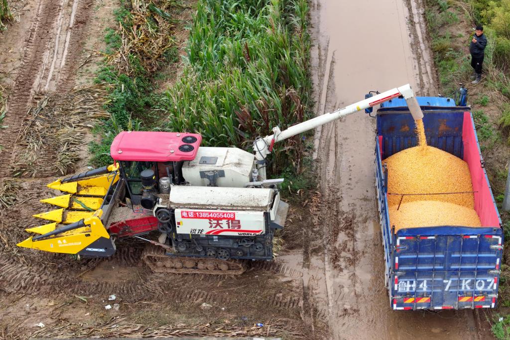2025年10月11日,在安徽省淮北市濉溪县百善镇张庄村,从河南驻马店调运过来的履带式收割机在收割玉米。新华社发(徐弘扬 摄)