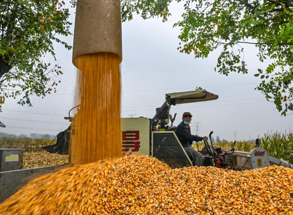 2025年10月8日,河南省商丘市夏邑县会亭镇郭楼村农民驾驶收割机收获玉米。新华社发(王高超 摄)