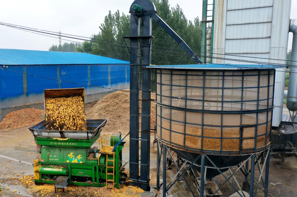 2025年10月10日拍摄的河北省衡水市阜城县古城镇一家粮食烘干企业作业现场(无人机照片)。新华社发(崔贤飞 摄)