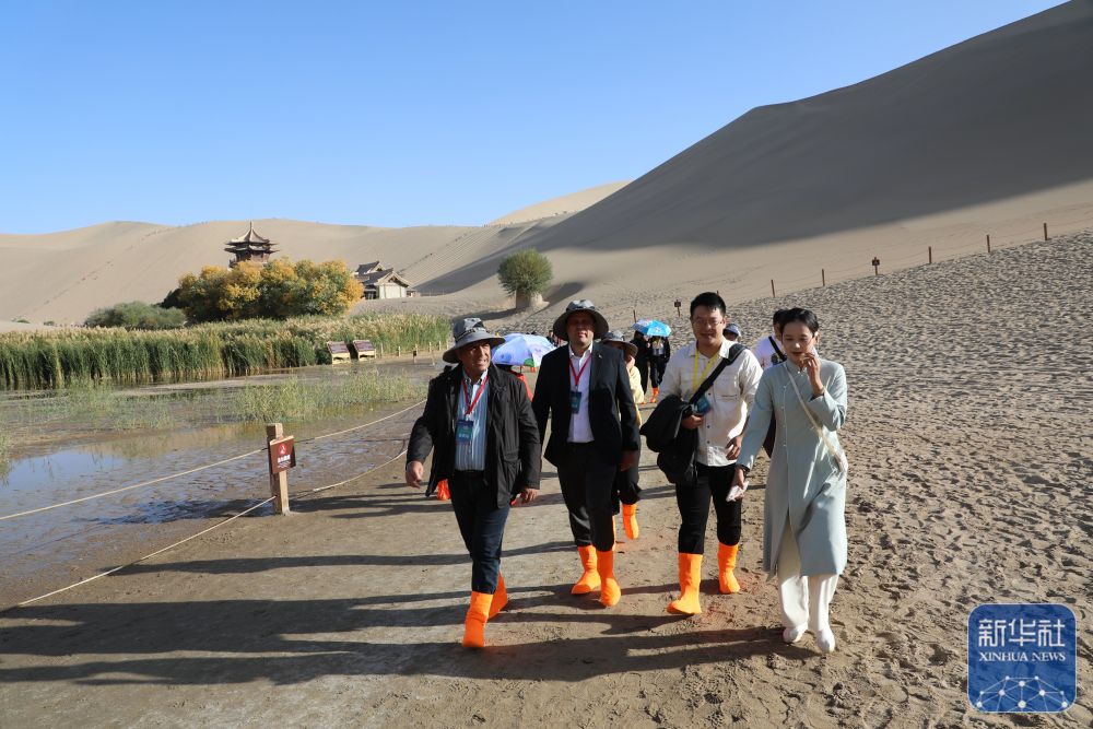 ↑ 10月12日,外国嘉宾在敦煌鸣沙山月牙泉景区参观。新华社发(王生元摄)