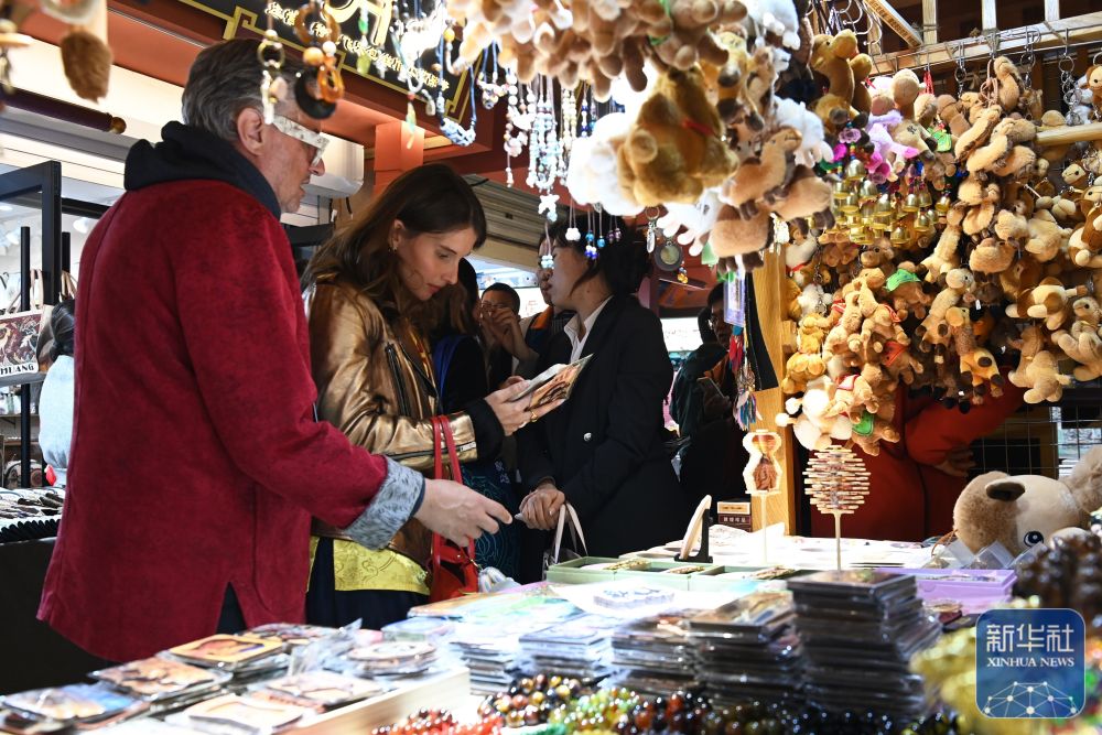 ↑ 10月11日,外国嘉宾在敦煌沙州夜市参观。新华社记者 范培珅 摄
