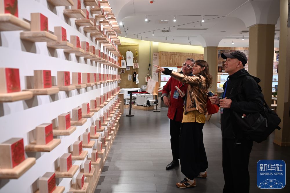 ↑ 10月11日,外国嘉宾在敦煌印局参观体验。新华社记者 张睿 摄