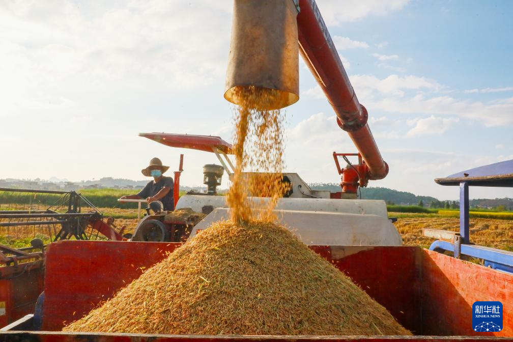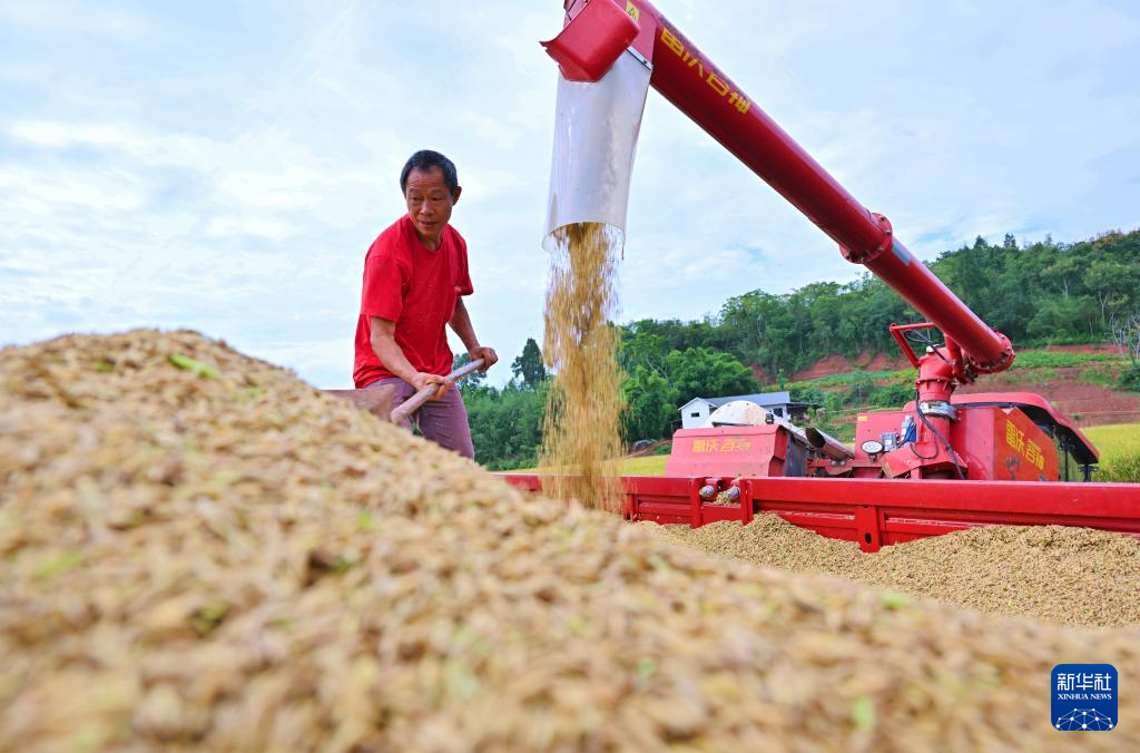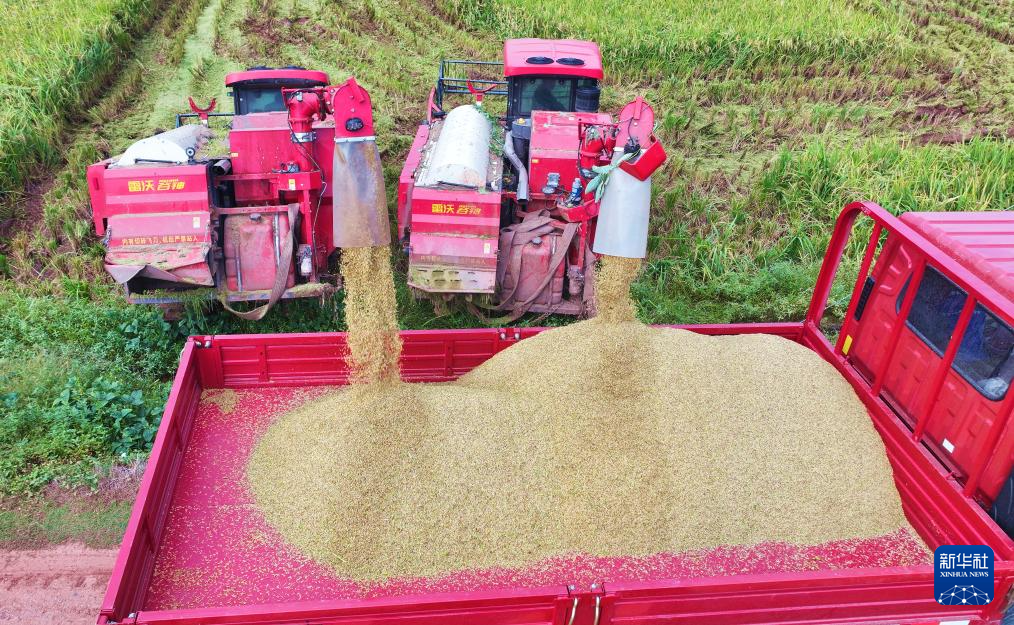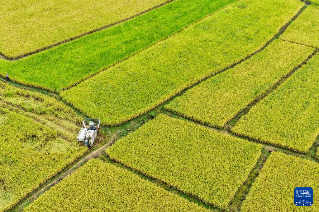10月15日,在湖南省永州市新田县新圩镇上禾塘村,村民驾驶收割机收获晚稻。新华社发(刘贵雄 摄)