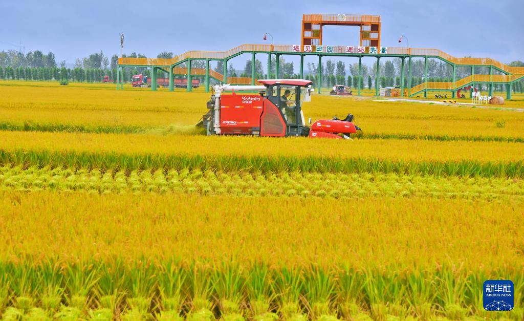 10月16日,在江苏省连云港市赣榆区城头镇中青墩村,种植户驾驶收割机抢收水稻。新华社发(司伟 摄)