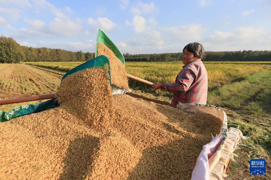 10月16日,在江苏省连云港市赣榆区城头镇中青墩村,种植户将收获的水稻装车。新华社发(司伟 摄)