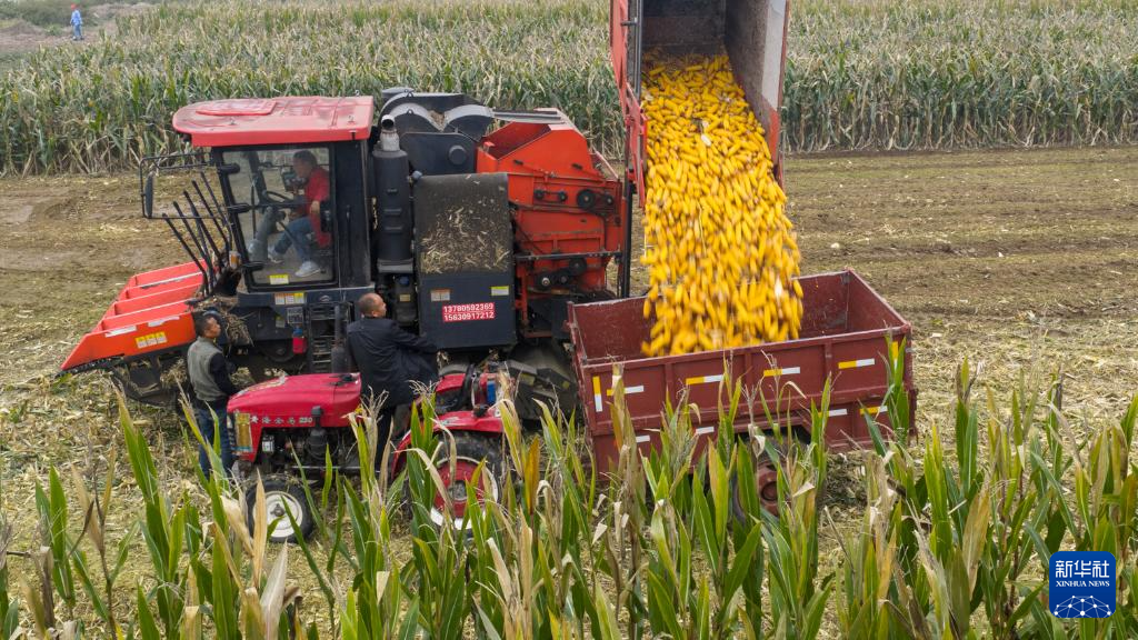 10月15日,在河北省内丘县大原村,村民驾驶机械收获玉米(无人机照片)。新华社发(刘继东 摄)