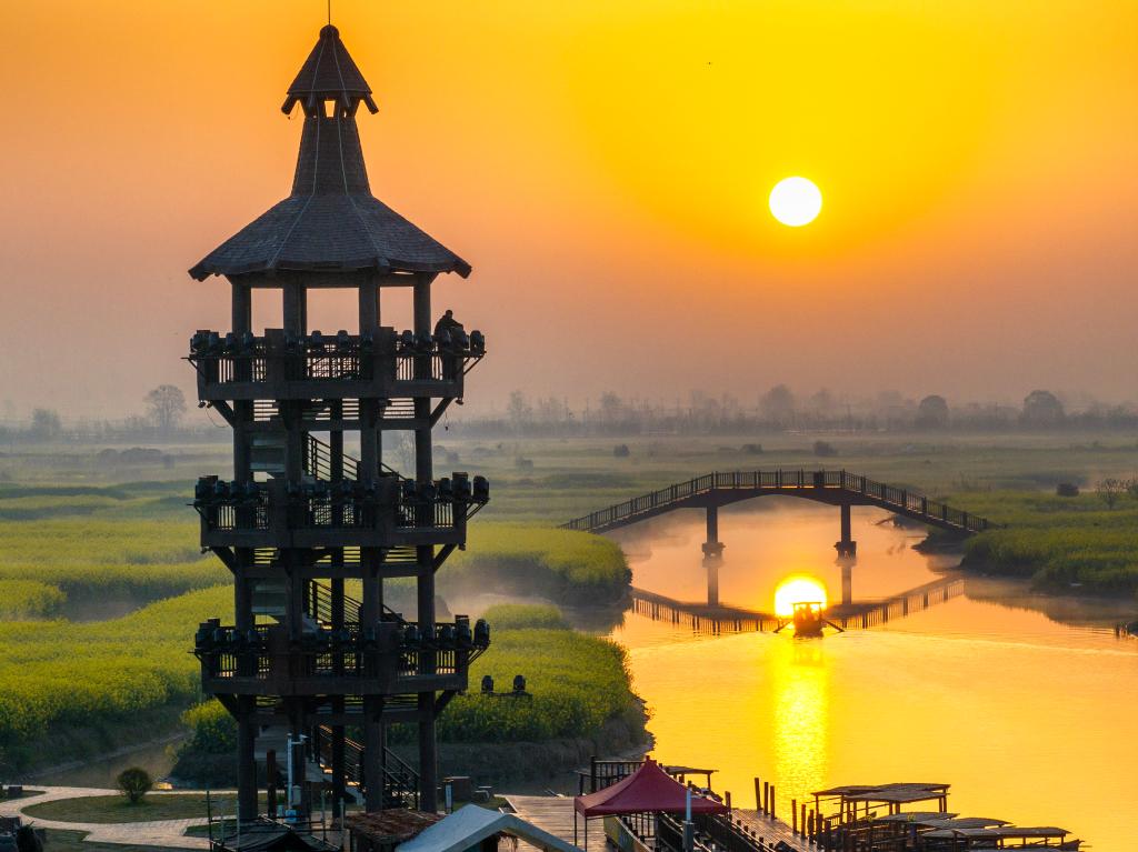 2025年4月8日拍摄的江苏省兴化市千垛景区日出晨景(无人机照片)。新华社发(周社根 摄)
