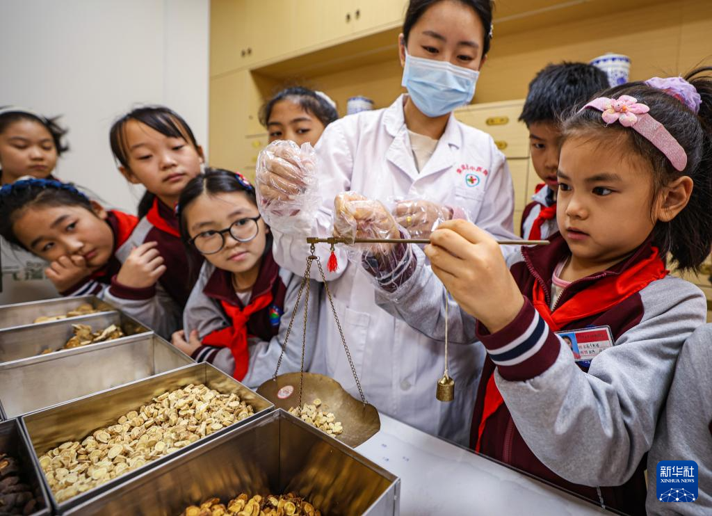 10月22日,在山东省荣成市中医院中医药科普馆,学生学习称量中药材。新华社发(李信君 摄)