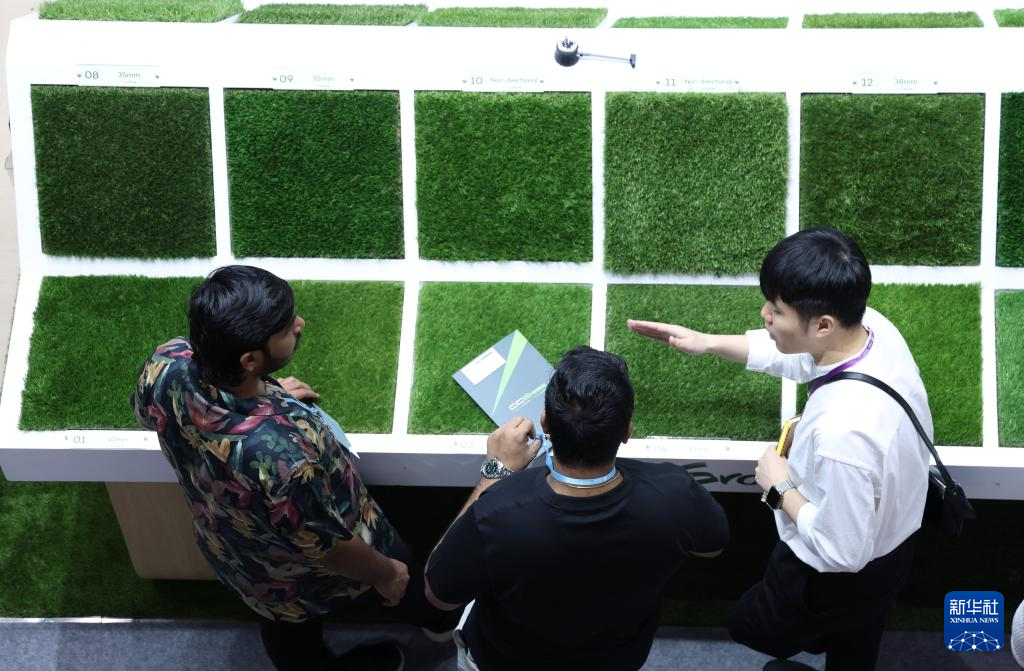 10月23日,客商在广交会上参观选购人工草坪。新华社记者 卢汉欣 摄
